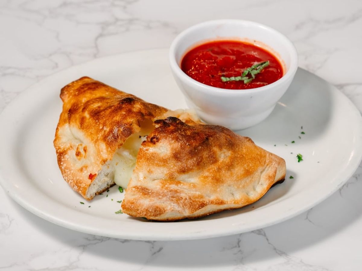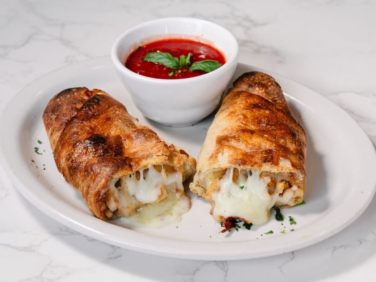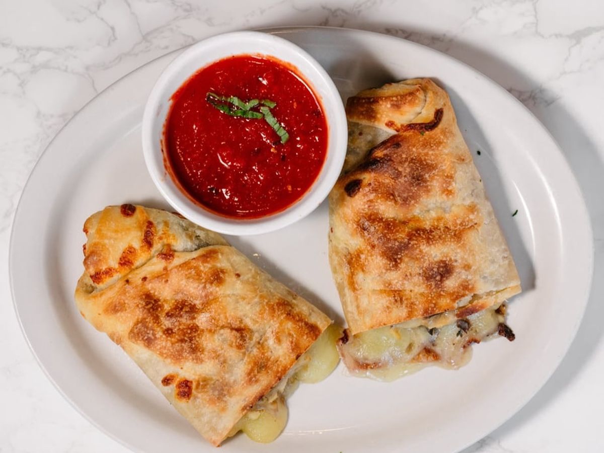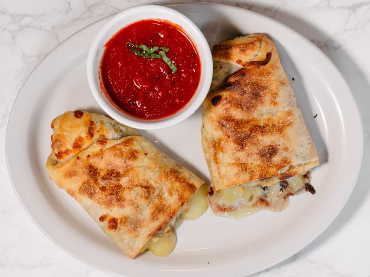 Filled with tender chicken, mushrooms, and melted cheese, wrapped in a golden-brown dough. Served with a side of marinara sauce.