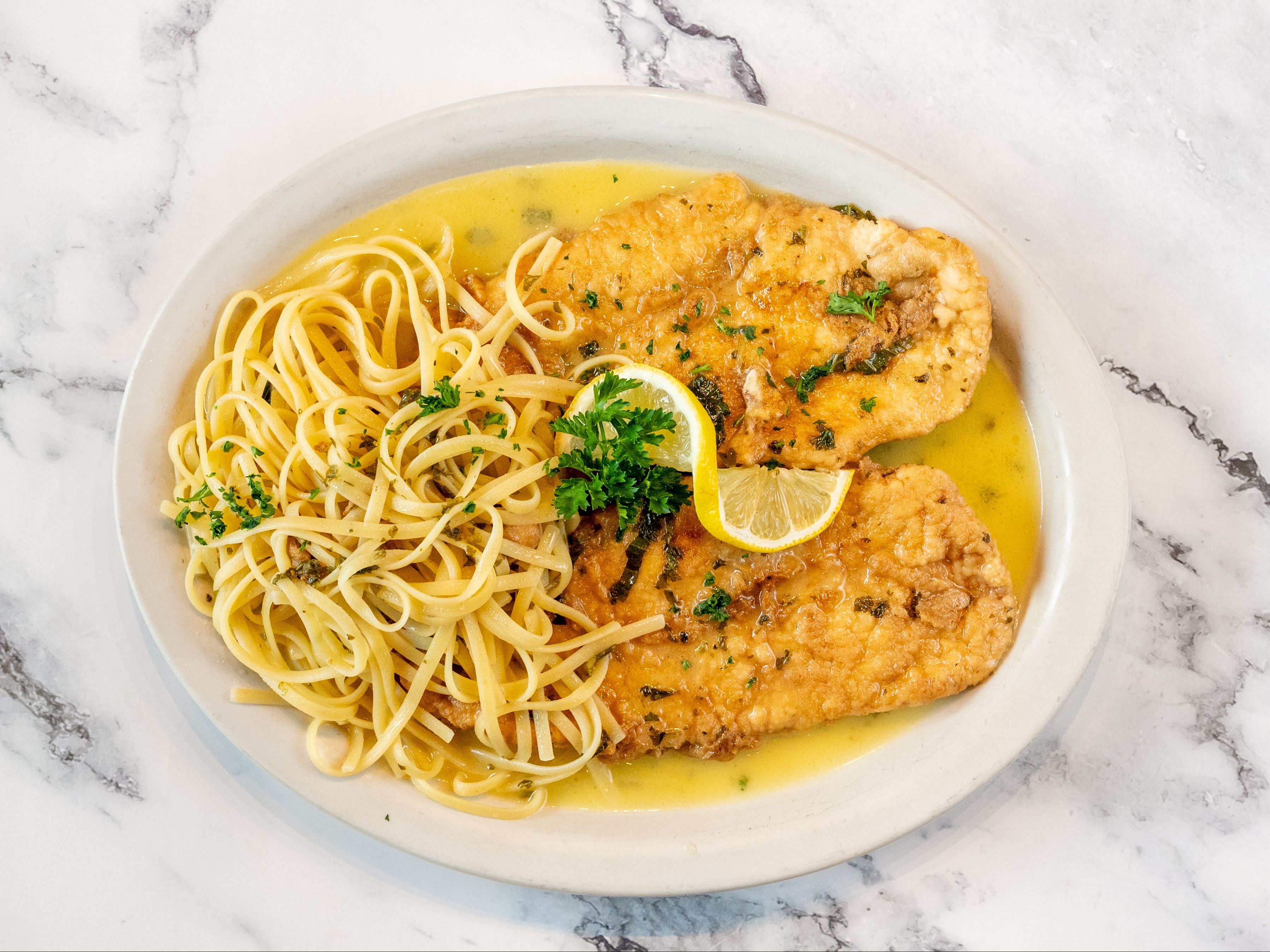 Breast of chicken in lemon-white wine sauce. Served with choice of pasta, garden salad or chefs choice of vegetables and focaccia bread.