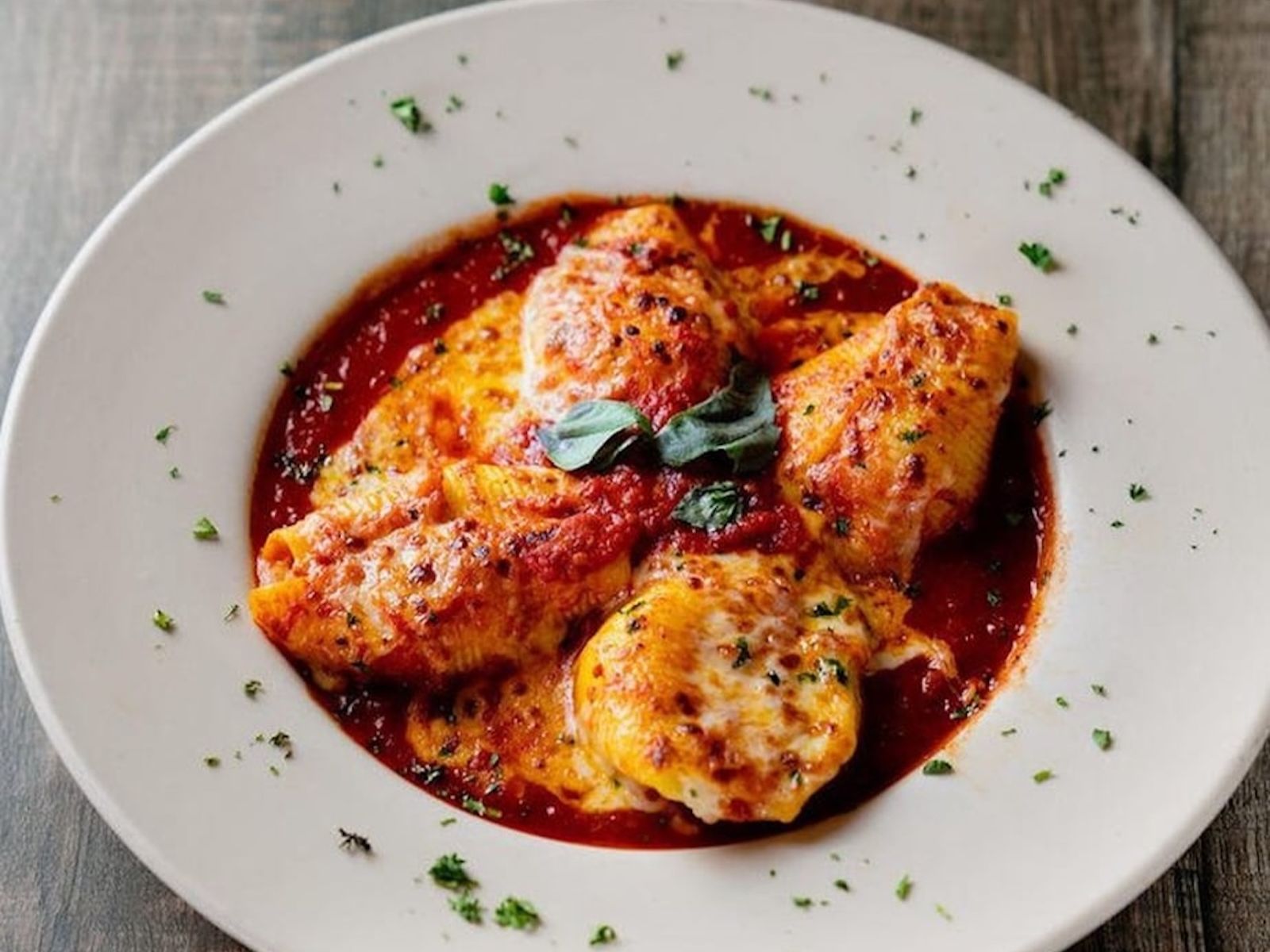 Ricotta-stuffed pasta shells in marinara sauce, topped with melted mozzarella and a sprinkle of herbs.