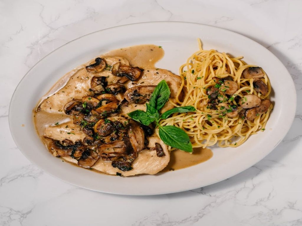 Veal scaloppine with mushrooms in Marsala sauce. Served with choice of pasta, garden salad or chefs choice of vegetables and focaccia bread.