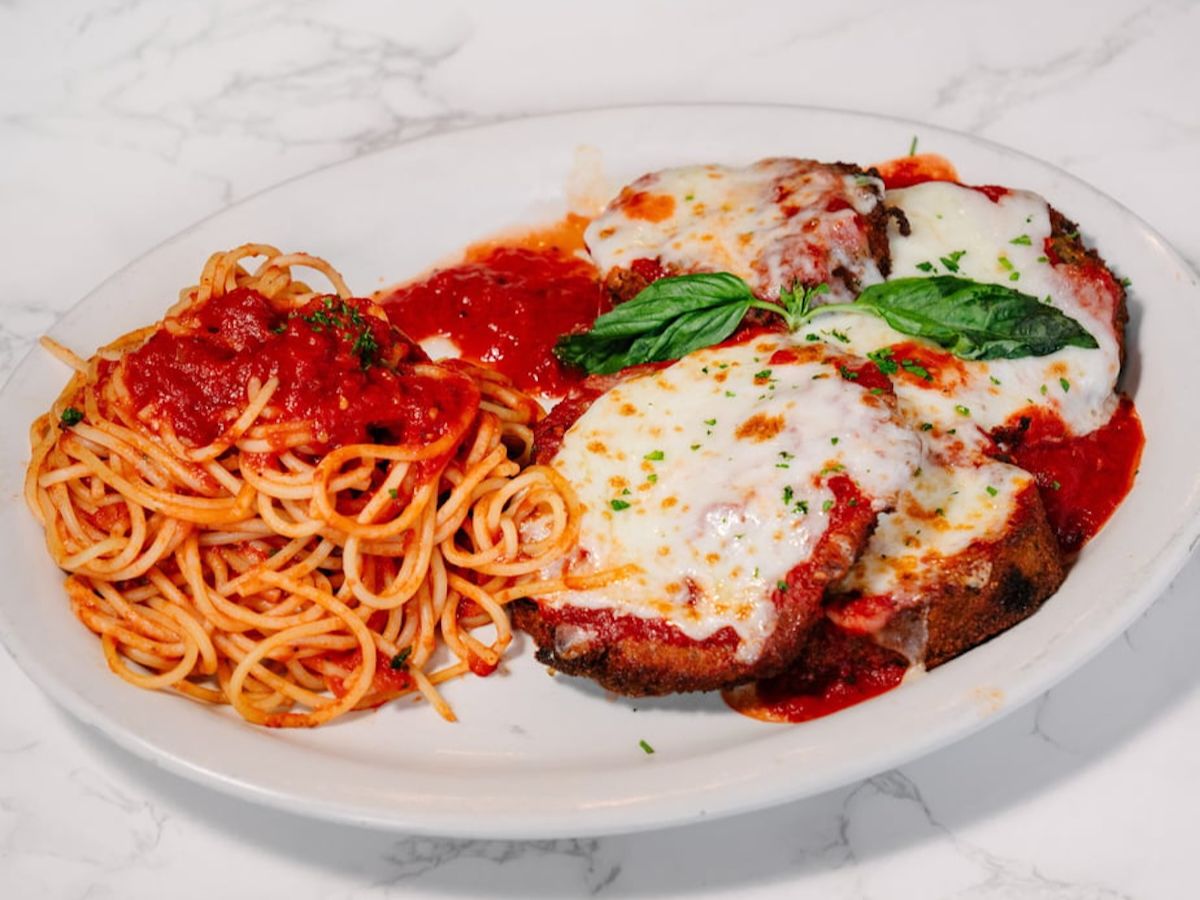 Chicken cutlet topped with a marinara sauce with a golden layer of baked mozzarella. Served with choice of pasta, garden salad or chef’s choice of vegetables and focaccia bread.