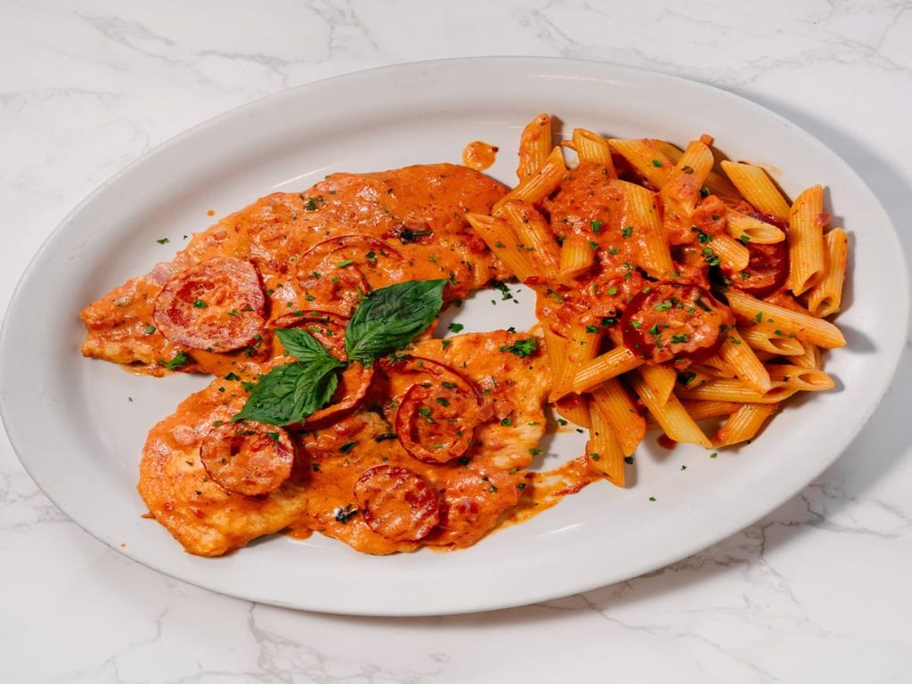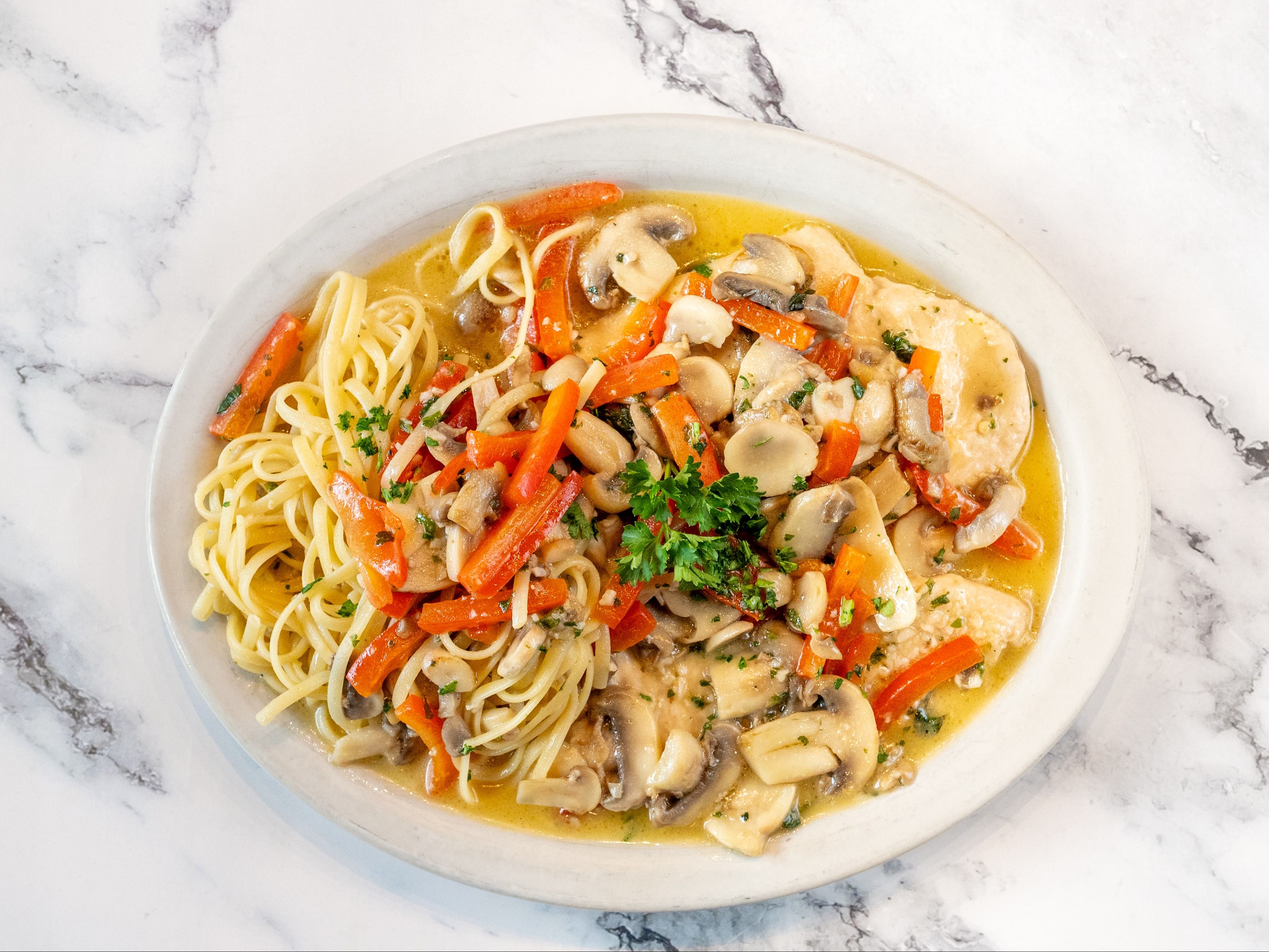Chicken breast saute in white wine, mushrooms, and roasted peppers. Served with choice of pasta, garden salad or chefs choice of vegetables and focaccia bread.
