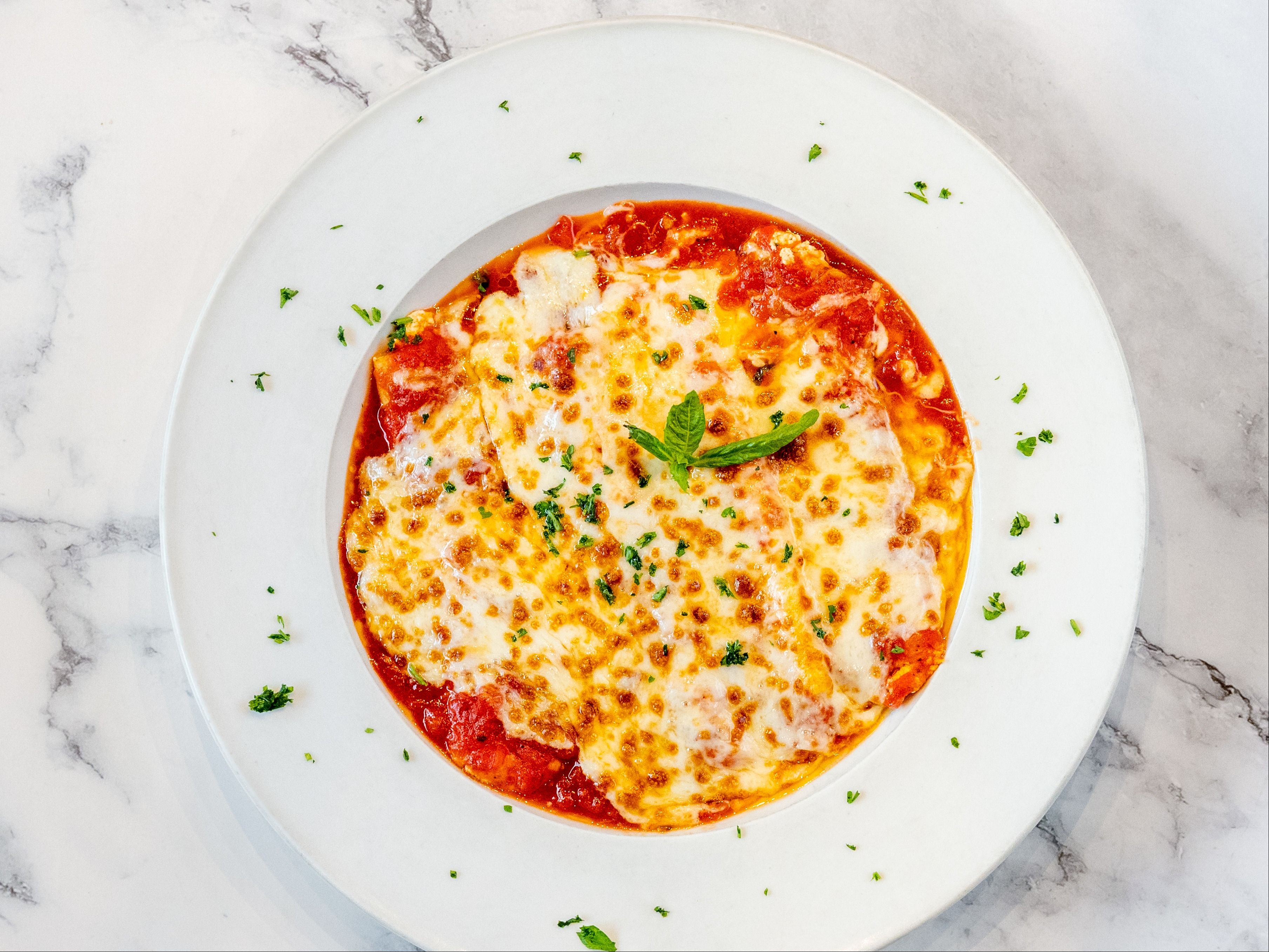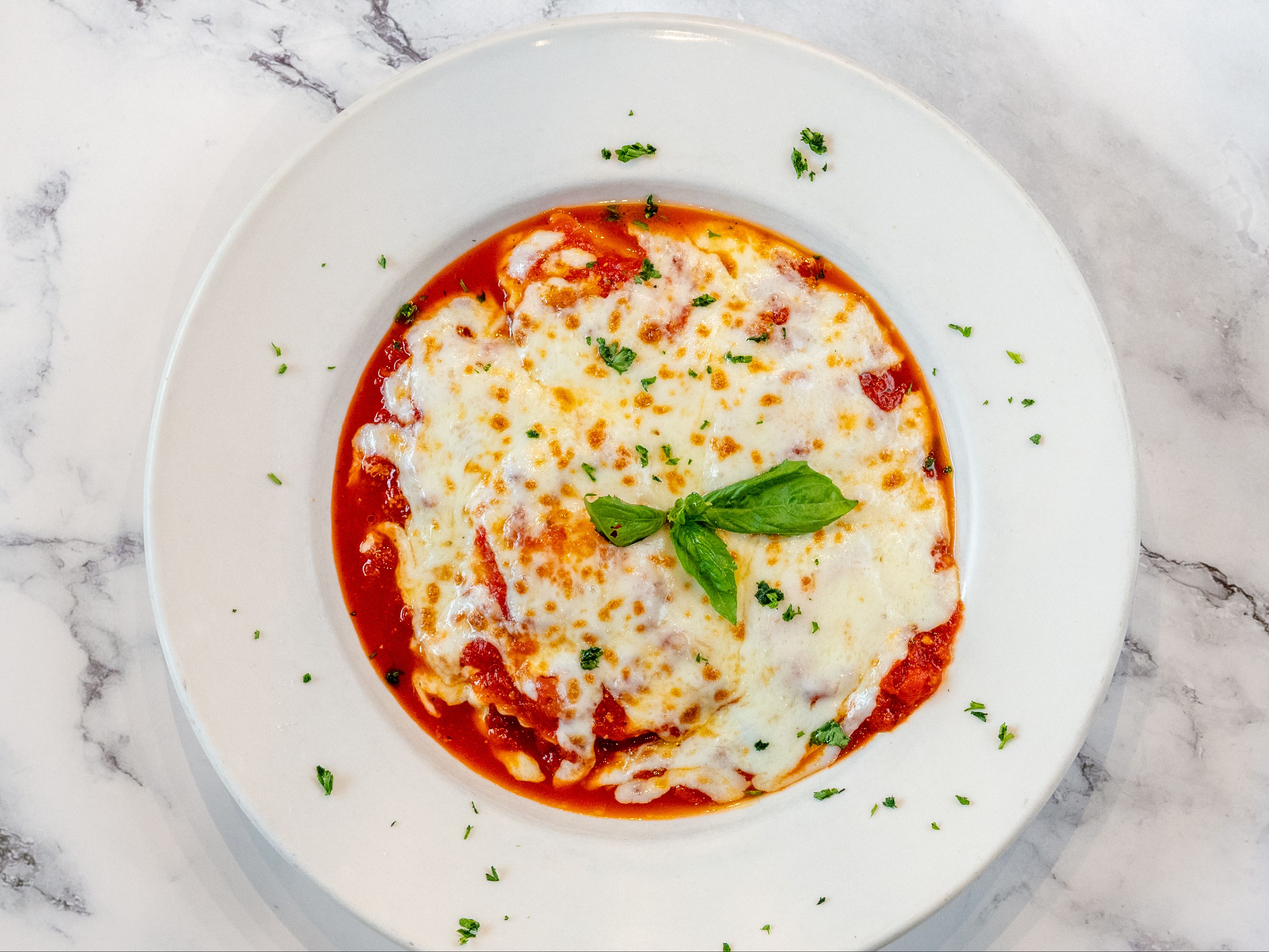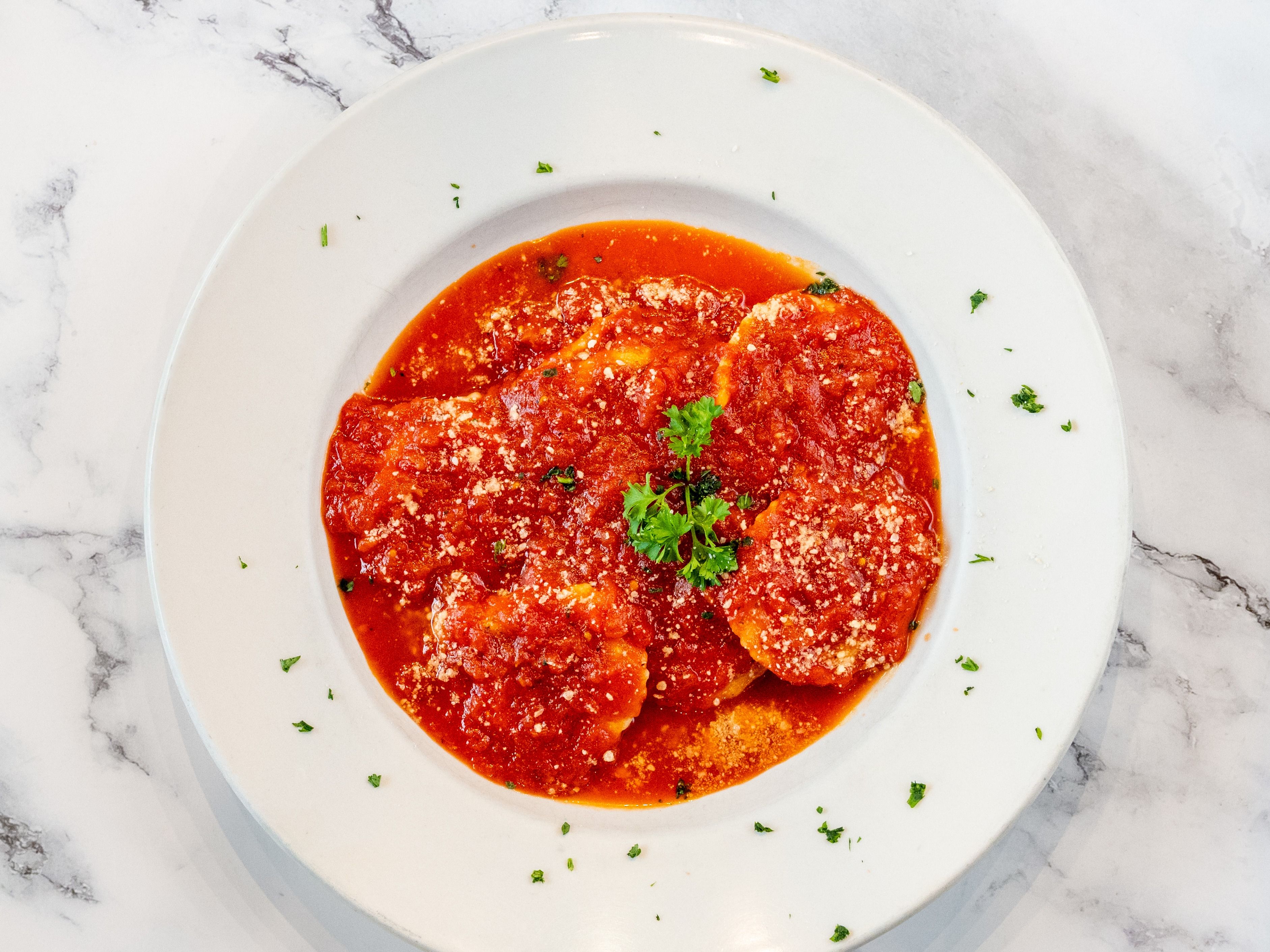 Ravioli filled with cheese, baked in a rich tomato sauce, and topped with melted cheese and herbs.
