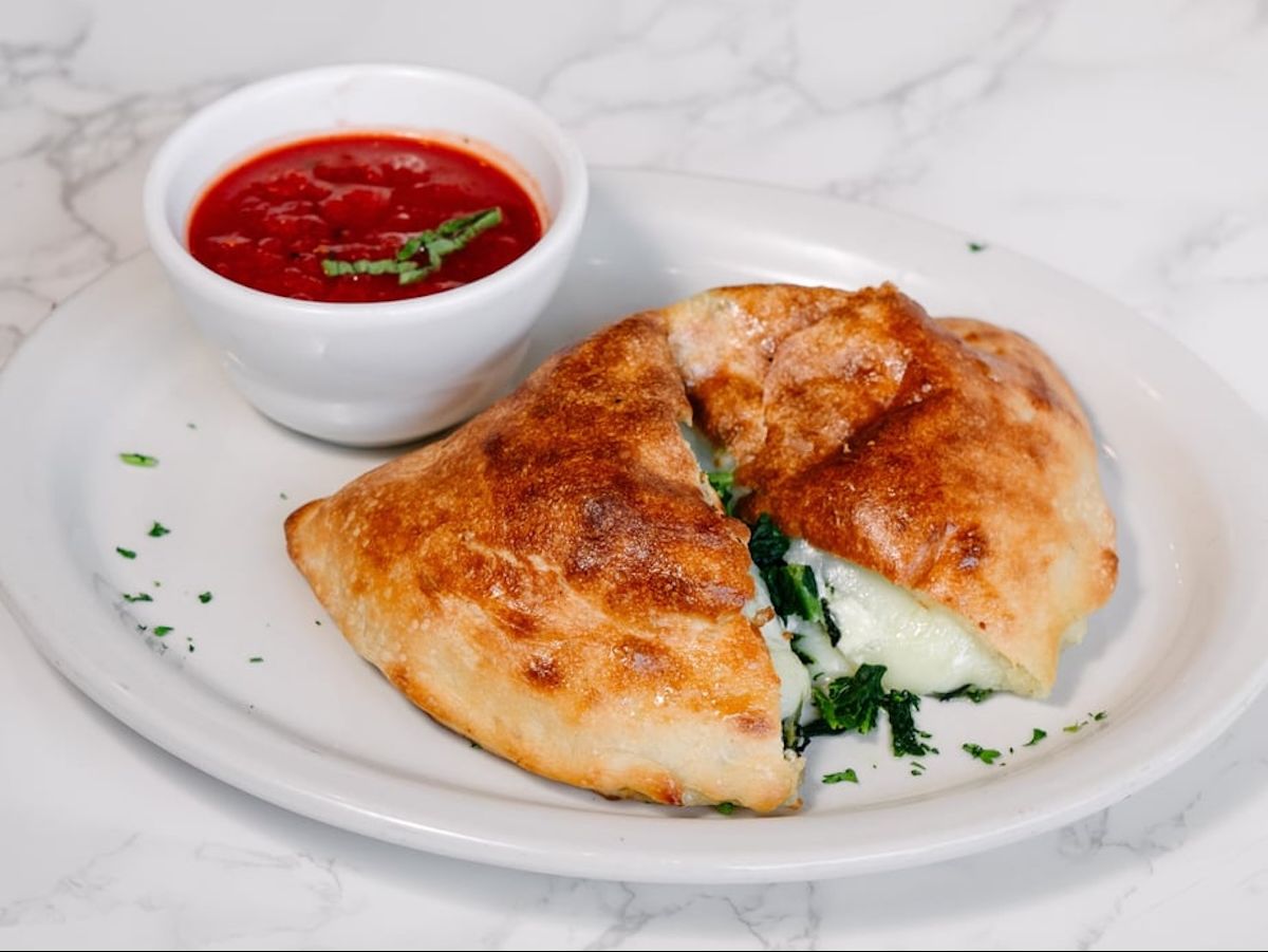 Golden-brown calzone filled with melted cheese and fresh spinach, served with a side of marinara sauce.