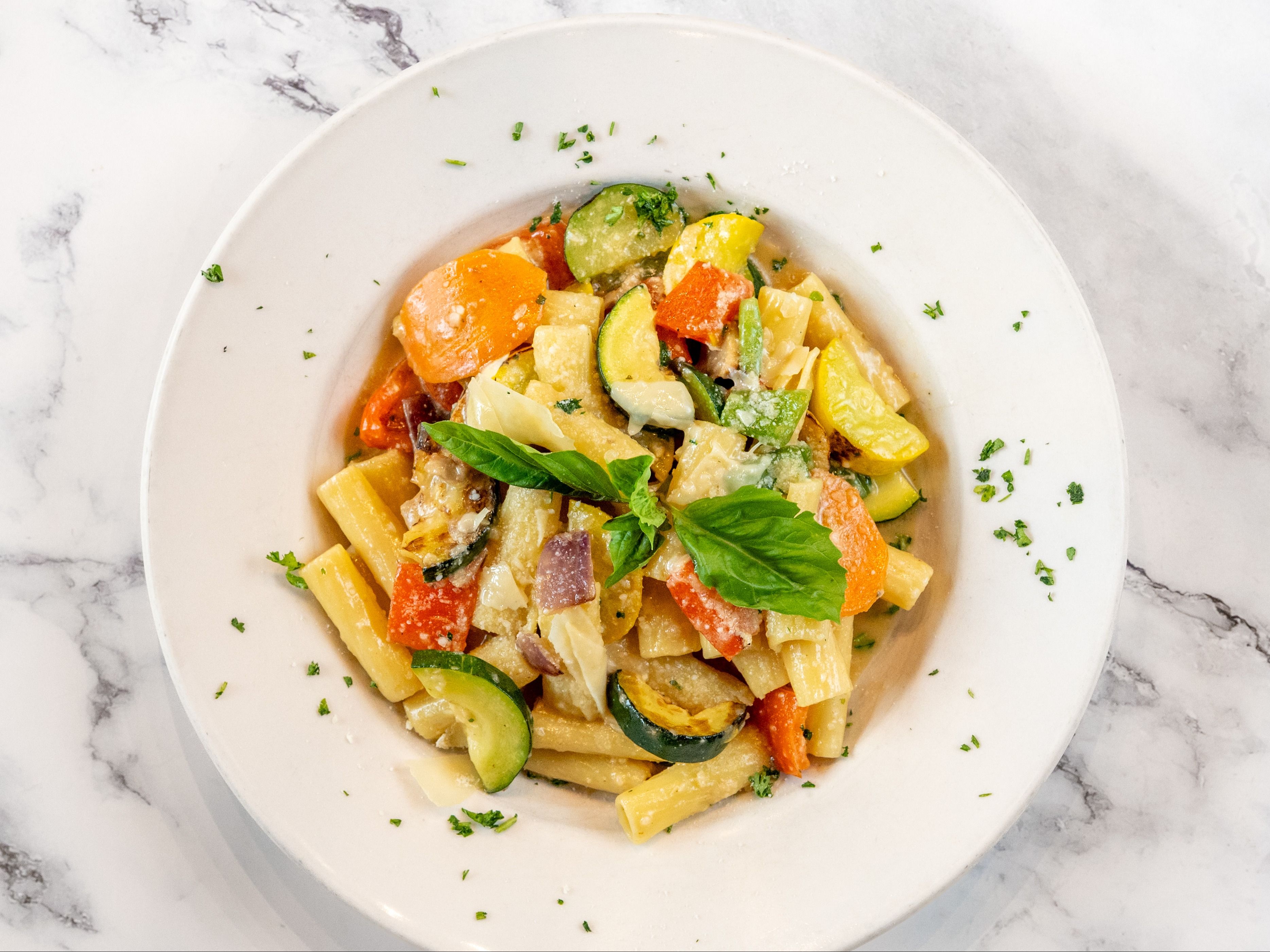 Rigatoni sautéed mix vegetables in garlic and olive oil.