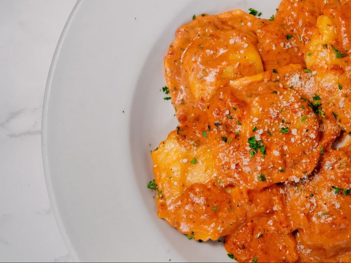 Lobster ravioli in pink sauce.