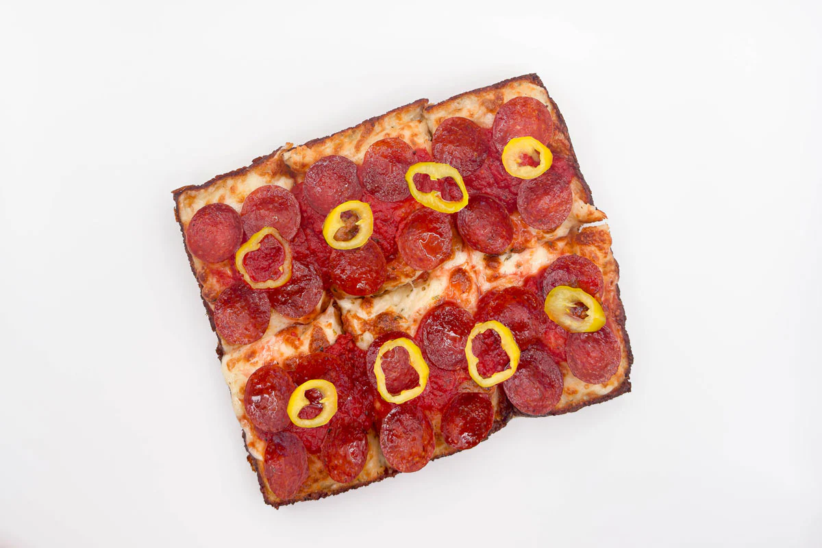 Thick, cheesy, and irresistibly crispy. Our Detroit-style pizza features a light, airy crust with caramelized edges, layered with mozzarella and your choice of any two toppings. Bold flavor in every square.